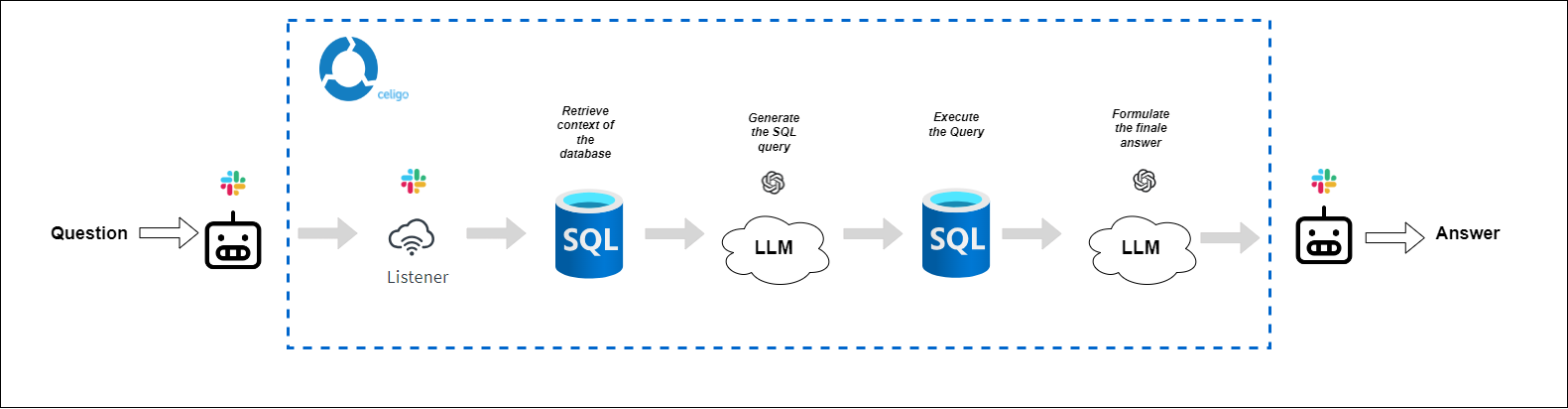 Here, we highlight an instance of Celigo’s AI-enhanced flow assistant. In this example, we showcase a Slack-based chatbot that converts natural language into executable SQL queries, a technique that’s revolutionizing our approach to querying structured data, transforming the way we interact with our data – making it as straightforward as asking a question.