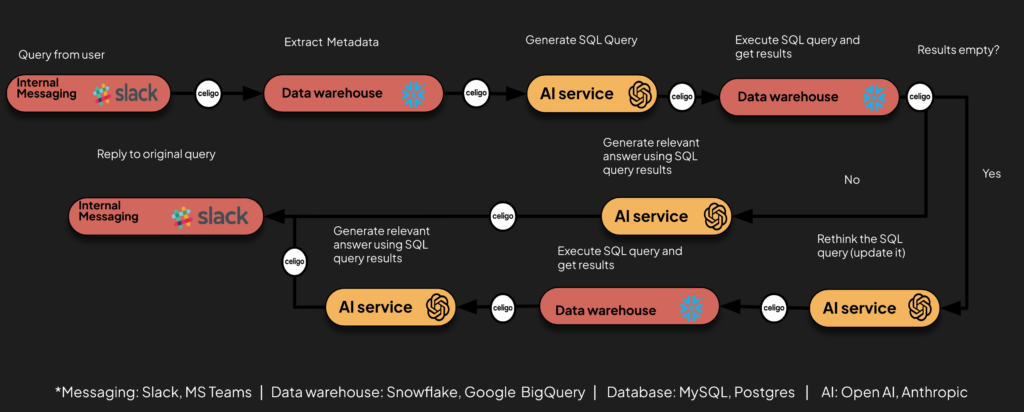 Previously, accessing complex datasets required data and BI analysts to write and execute SQL queries. This process was time-consuming and limited to those with technical skills. Today, Celigo’s AI-driven platform allows business users to interact with their data directly. By using natural language queries through messaging interfaces like Slack or Microsoft Teams, users can receive real-time insights without needing to understand SQL.