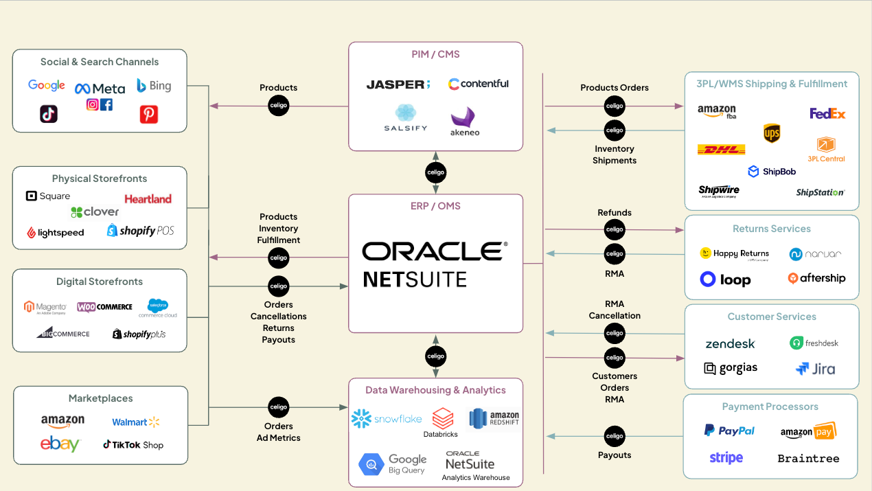 The first step toward automation is integrating your core systems. One way to do this is to use your enterprise resource planning (ERP) system, such as NetSuite, as a central data hub. By connecting all your channels—social media, physical storefronts, digital storefronts, and marketplaces—with your ERP, you can sync real-time data and create a single source of truth.