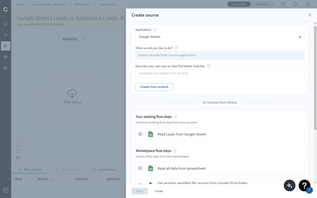 When you click ‘Create Source’ to start building a new flow and search for the app of your choice, you will receive suggestions for existing flow steps and flow steps from Celigo’s Marketplace based on your application.