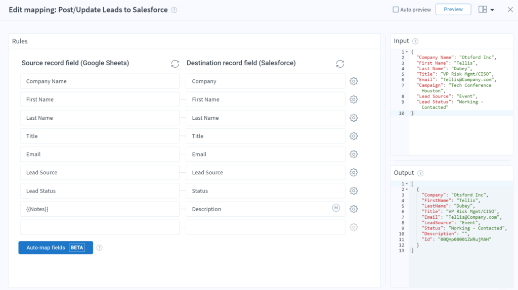 If you’ve created your connection, entered the ID from your spreadsheet URL, and specified the spreadsheet name, you can hit preview and see each spreadsheet row come through like a record from any other business application.
